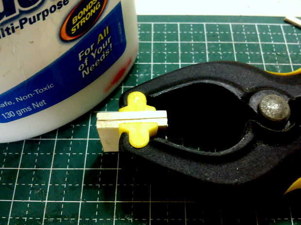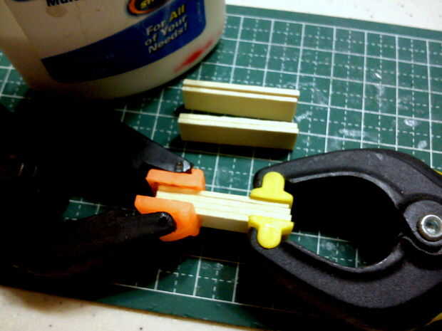 Piezas de un trozo de que paleta bajalengua tamaño palos para el montaje de motor y el radiador fueron cortadas con un cortador Olfa. El montaje de motor estaba pegado al chasis de la Coupe Creepy justo en frente del compartimiento de controladores. Después de que el pegamento ha fijado, el radiador fue pegado justo en frente del chasis motor.