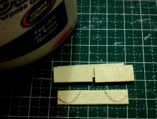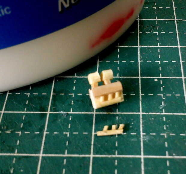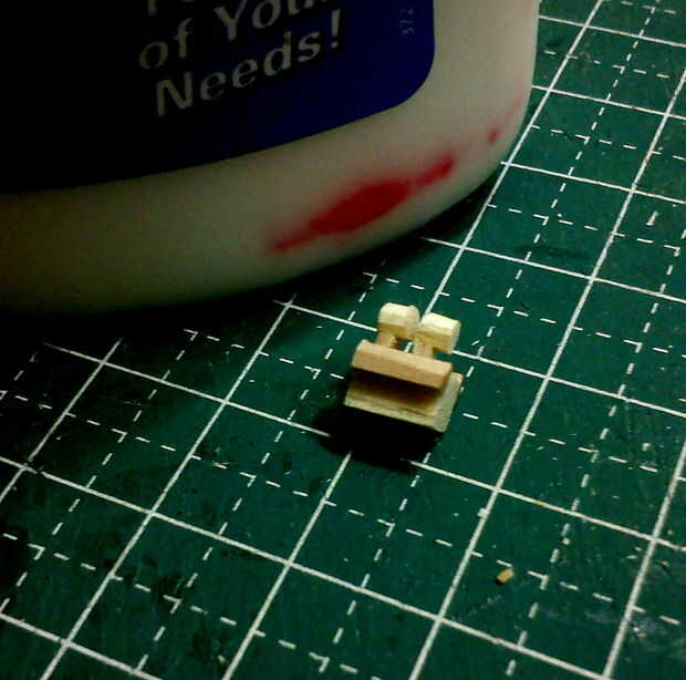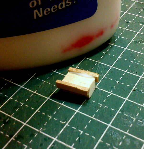 Bloque del motor de la Coupe Creepy fue cortado desde el extremo de un palito repuestos depresor de lengüeta de tamaño. 3 tres capas laminadas y lijadas suaves con el uso de un accesorio fino lijadora de disco. Las cubiertas de la válvula se corta de fósforos y pegadas a la parte superior del bloque motor.