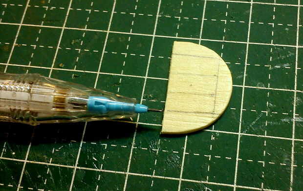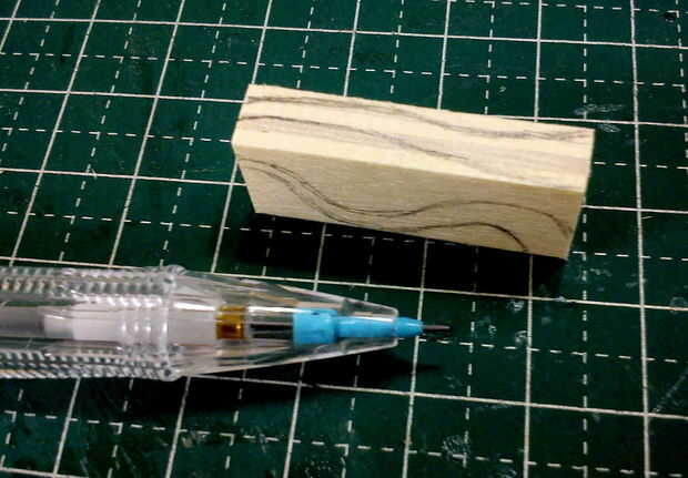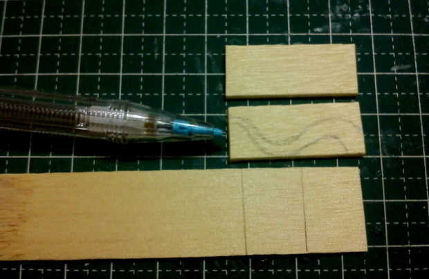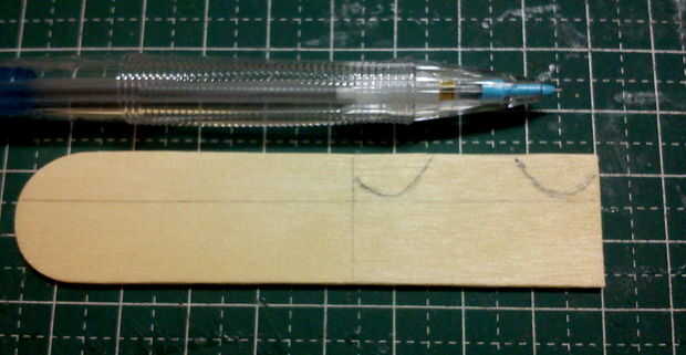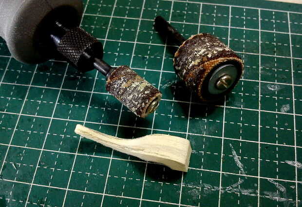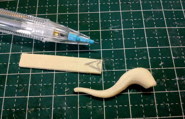 Un patrón fue dibujado en la parte superior y lados para actuar como una guía en la talla de la pieza en forma de cola de dragón. Los accesorios lijadora de tambor grueso/fino se utiliza para la forma áspera y terminados con un accesorio de la lijadora de disco en un MiniMite. La punta de la 'punta de flecha' fue hecha de chatarra paletas palos cortado y pegan en la punta de la cola de dragón.