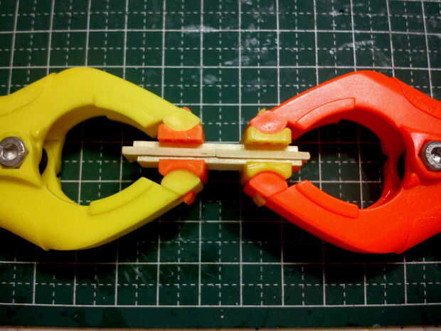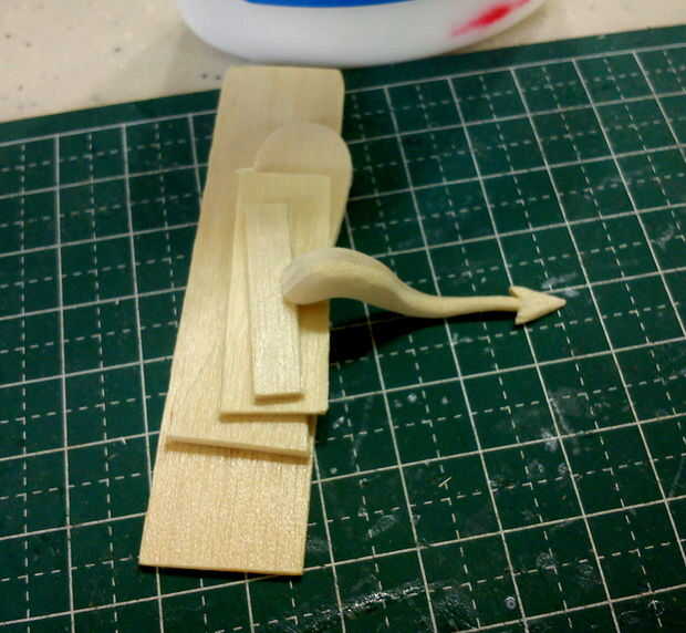 La cola comenzó como 4 cuatro capas de un palo de paletas bajalengua tamaño en rodajas. Para aumentar la rigidez de la cola para soportar el pulido áspero, uno de la capa media se lamina con el madera perpendicular a las capas externas del grano. El terminado bloque rectangular se permitió secar completamente antes de empezar cualquier pulido/talla.