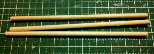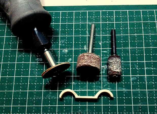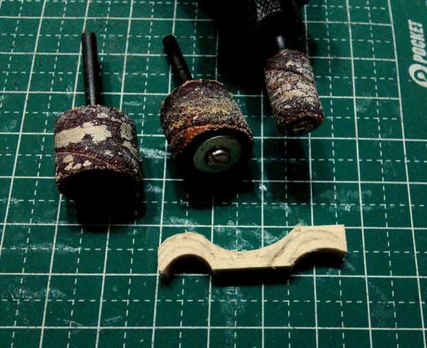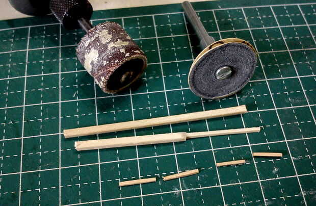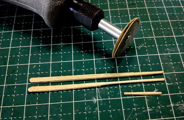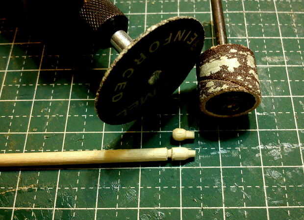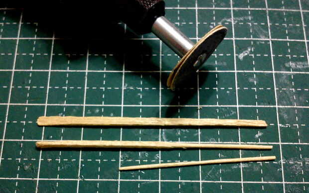 Los ejes de dos 2 ruedas fueron hechos de palillos diluidos en forma utilizando un accesorio de la lijadora de disco fino de una herramienta de moto Minimite.