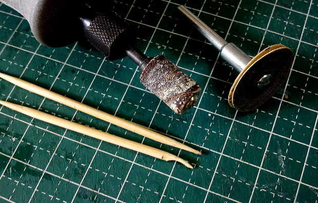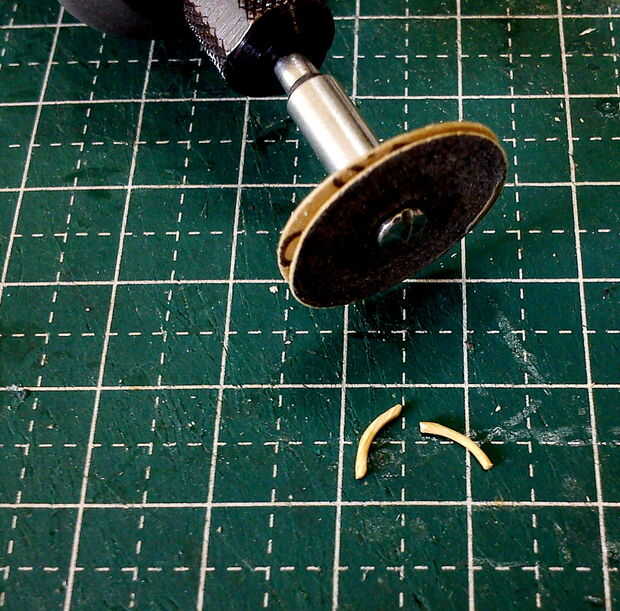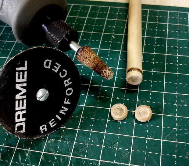 Las 5 cinco piezas de las ruedas fueron hechas de un taco grande. Un agujero se 'describen' con un óxido de aluminio de #953 pulido de piedra para simular los cubos de rueda. Cada rueda fue entonces cortado de la espiga usando un accesorio de rueda de corte reforzado montado sobre un Dremel 3000.