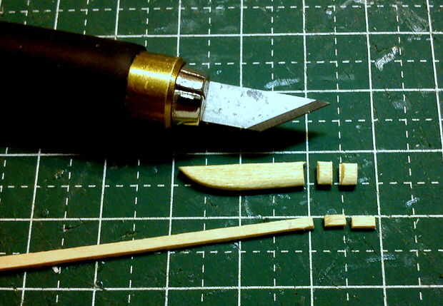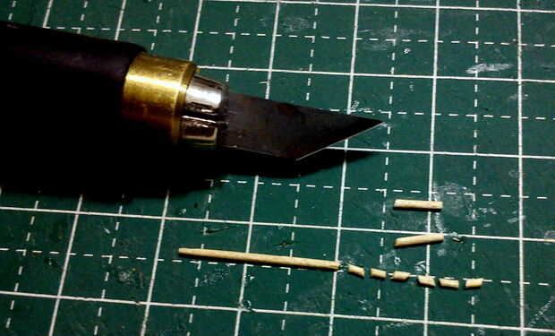 Para el vástago del faro, se utilizaron palillos redondos. La metodología para talla y forma de la espiga de la linterna fue similar al proceso que utilizan en la fabricación de los patines de aterrizaje de la cañonera AT-99 Scorpion de Avatar (instructivo Nº 4).