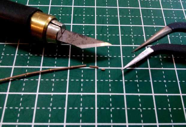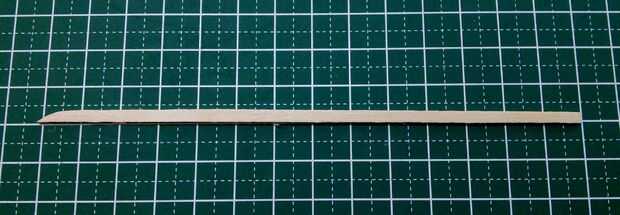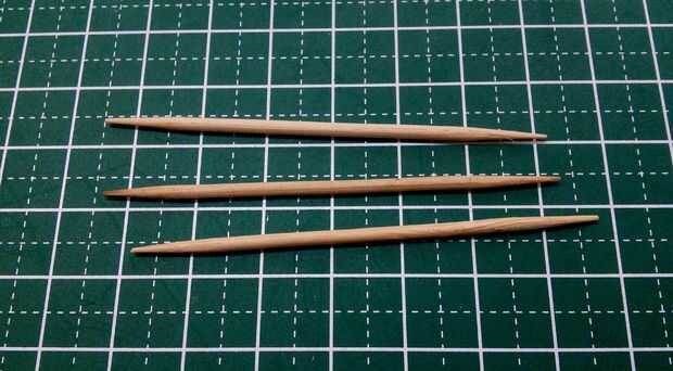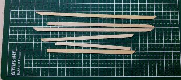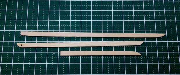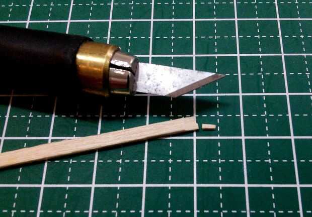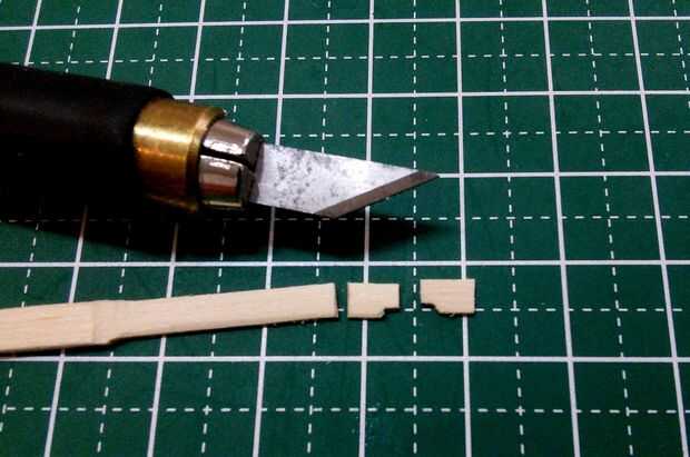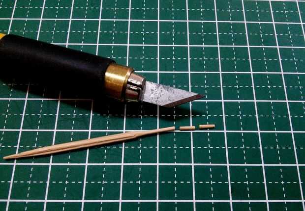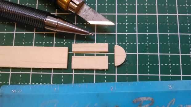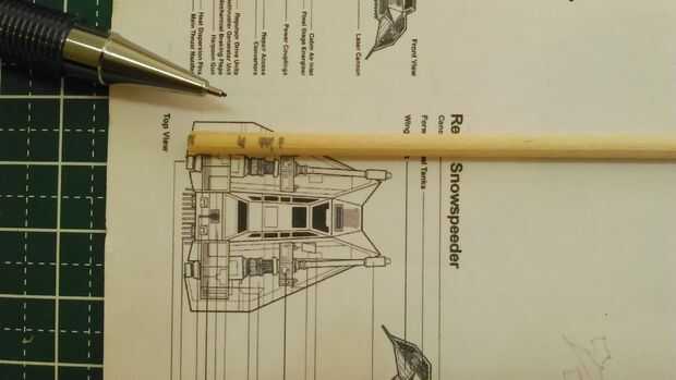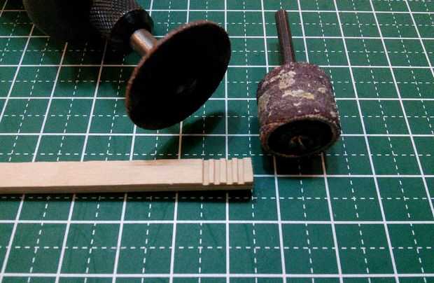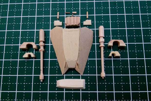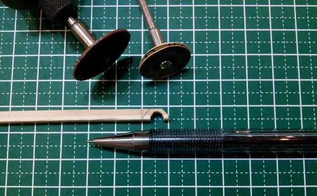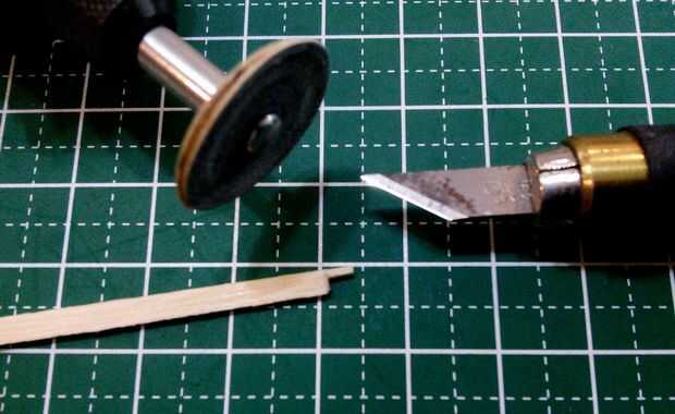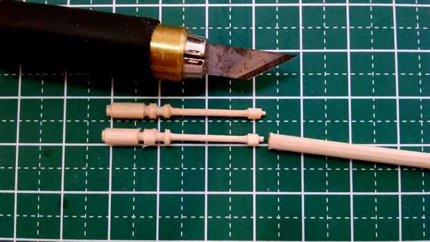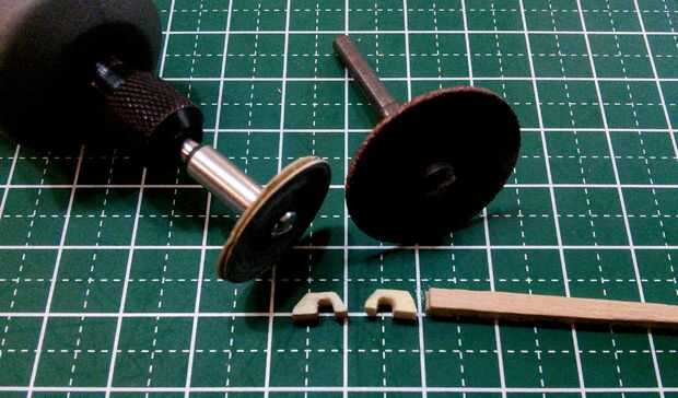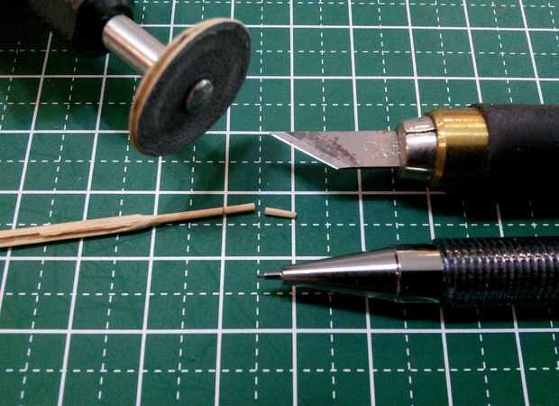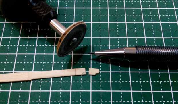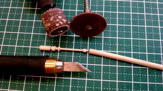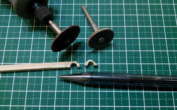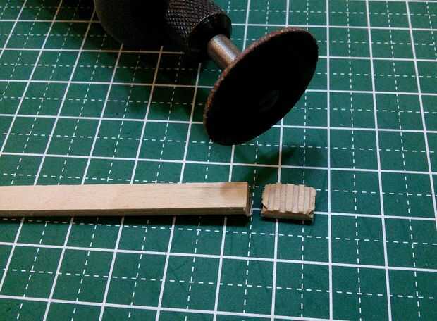 Pequeños tacos de madera se utilizaron para el par de cañones láser y subconjuntos de la hélice. Marcas se hicieron para las ranuras en los esquemas de the-blueprints.com base. Los surcos fueron cortados usando un disco de corte estándar montado en una Dremel 3000. Los barriles fueron tallados utilizando un accesorio de lijadora de tambor fino en una herramienta de la moto. Cada pieza acanalada fue separado de la clavija de madera usando un cortador Olfa.