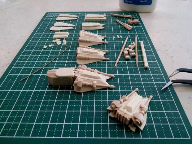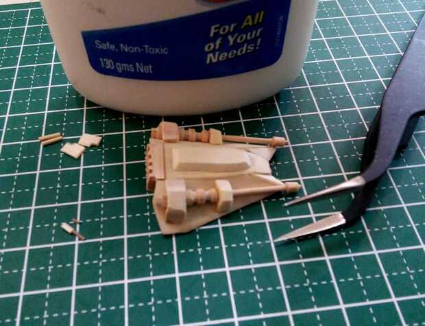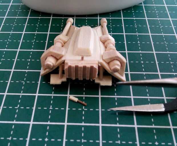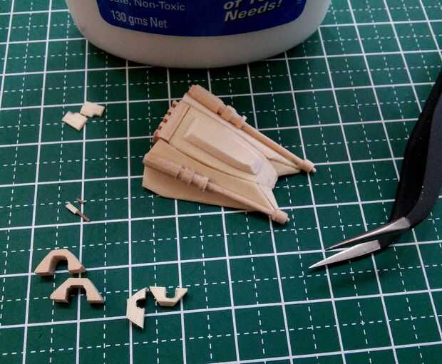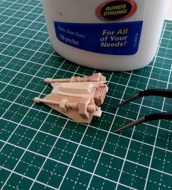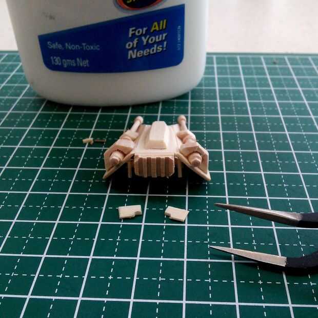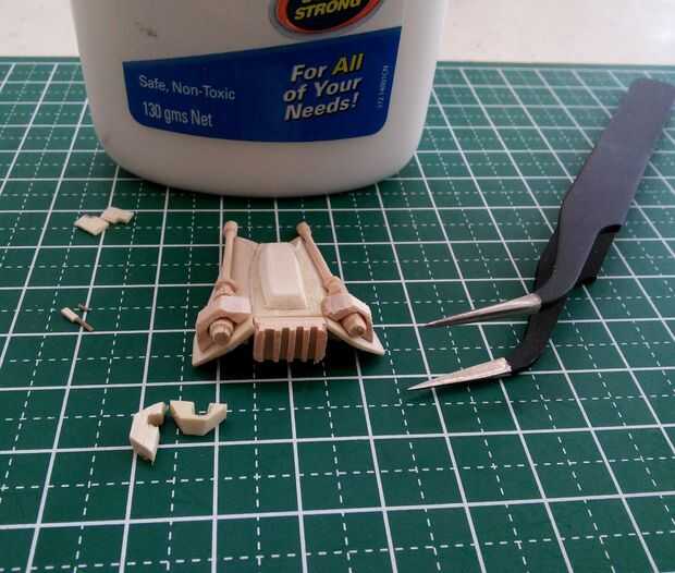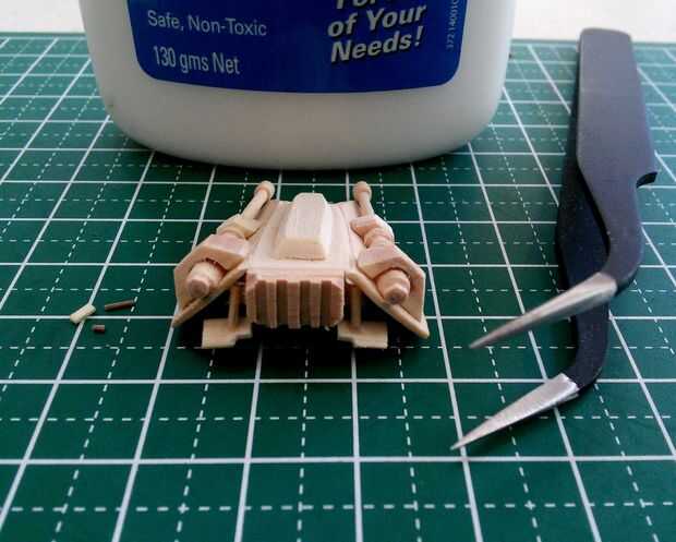 Las partes más interesantes para montar eran probablemente los dos conjuntos de armas/propulsor láser masivo. Pegar cada ensamble de las alas requiere un montón de pequeños ajustes para asegurarse de que la parte delantera y trasera monta (acoplamientos de energía frontal y popa repulsor montajes) se alinean en el centro del ala y se inclinan un poco hacia el centro de la nave.