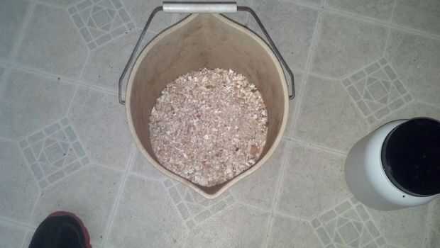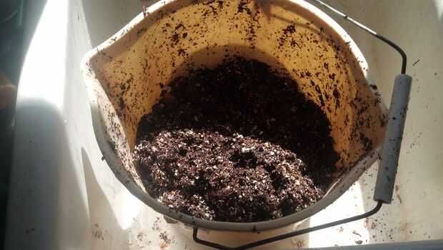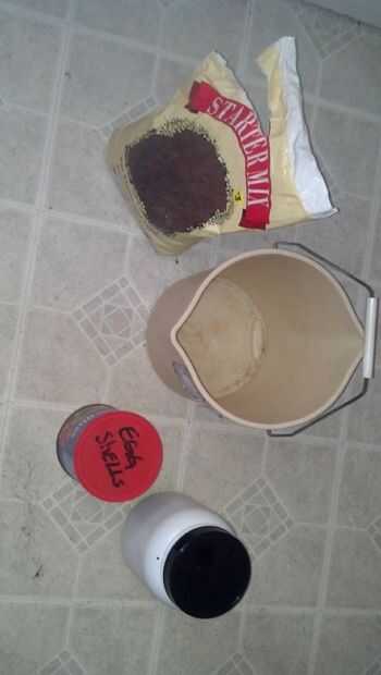 Ahora que ensuciarse un poco, descarga las macetas en primera ya que tienden a ser polvorientos (3 libras), luego he añadido las cáscaras de huevo machacadas (poco más de 1 1/2 libras) y el café molido en la parte superior (3 lbs) estos todos salvos en los últimos meses dentro en grandes contenedores después del desayuno. Con el crudo invierno que ha sufrido la NE no pude llegar a mi pila de compost. las cáscaras fueron "cocinadas" en el microondas hasta que se seca (aproximadamente 3 minutos) después triturados con un pequeño mazo de madera como los que venden como "cangrejo mazos" guardado en un viejo contenedor de cacao caliente, los granos de café fueron ya húmedos como se mantuvieron en un recipiente cerrado.