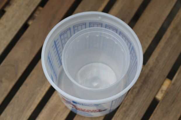Seleccione los contenedores adecuados La primera decisión importante es cuánto volumen desea su barco acabado para sostener. (Recordar, por supuesto, que este recipiente de hielo funciona mejor para las aplicaciones de una sola vez, por lo que ayudará a precisar sobre exactamente cuánto congelado bondad será comer/porción.) Un cuarto o una pinta es probablemente un buen tamaño para empezar. He utilizado los contenedores estándar de quart que es probable encontrar en cualquier restaurante. Una vez que usted haya decidido sobre una cantidad, empezar a buscar envases plásticos que son relativamente compactos en la forma que el volumen que desee. El más compacto de una forma, más eficiente que será su enfriador. Relación área/volumen menos superficie significa menos lugares para el calor llegar su congelador. ¿Encontrado un recipiente de plástico bien para moldear el interior de su embarcación? ¡ Excelente! Ahora necesitarás encontrar el segundo envase de plástico que es al menos 1" más grande que la primera en todas las dimensiones. Este recipiente va a hacer la forma exterior de su refrigerador. En una ferretería, me encontré con una agradable 2 1/2" cuarto de galón pintura tina que es del tamaño adecuado para ser el molde exterior a mi contenedor de 1 qt. (Ya que este contenedor realmente no va a entrar en contacto con alimentos, no estaba demasiado quisquilloso sobre búsqueda de plástico de calidad alimentaria. Dicho esto, ciertamente no usar nada de lo que había sido utilizado para almacenar cualquier cosa que usted no quiere cerca de su comida.)