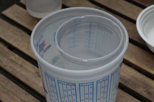 Molde relleno. Lentamente vierta agua en el molde exterior, si su molde interior está al descubierto, tenga cuidado de no salpicar en el interior. Una vez que el molde interior comienza a flotar, frenar y mantener verter hasta que haya al menos 1" de agua debajo del molde interior.