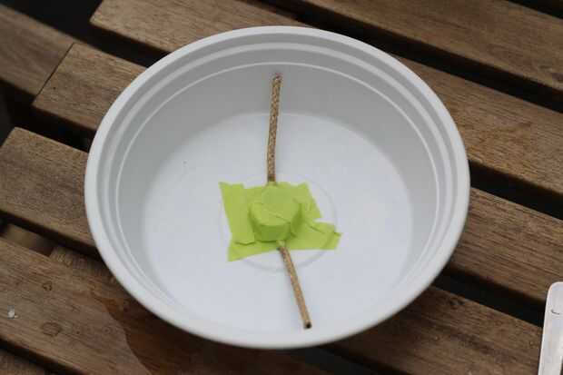 Hacer el mango. Corte un pedazo de 6-8" del hilo o cable. Cortar dos pequeñas muescas en los bordes opuestos de la tapa de la botella de agua plástica. Deben ser sólo lo suficientemente grandes como para contener su pedazo de guita. Ajuste la pieza de cuerda en la tapa e invierta. Virar la tapa de la botella de agua para el centro de su molde de la tapa exterior con dos pequeños pedazos de cinta. (Más adelante, vas a quitar la tapa de plástico y la cuerda expuesta hará una manija para su tapa).