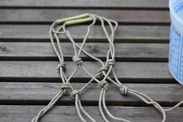 - Asas lazo o hilo. Si usted quiere los mangos de la tubería, corte dos 3" piezas de la tubería. Enrosque dos trozos de hilo por cada mango y deslice el mango hacia el centro de la cuerda. Si no está utilizando la tubería, sólo puede atar dos nudos para asegurar espacio para una manija en 3" aparte. Tome dos de las longitudes de hilo y un nudo 8" del borde del mango. Repita con la otra manija. Tomar una de las restantes piezas sueltas de hilo y atar a otra pieza suelta de la otra manija en aproximadamente 7 1/2" del borde del mango. Repita en el otro lado. Ahora tienes la primera fila completa de los nudos. Si tiene su molde exterior libre, agarrarlo y ajuste la parte superior de su soporte alrededor de la nave. La fila superior de los nudos debe quedar uniformemente si usted extiende los nudos alrededor del borde superior de su molde.