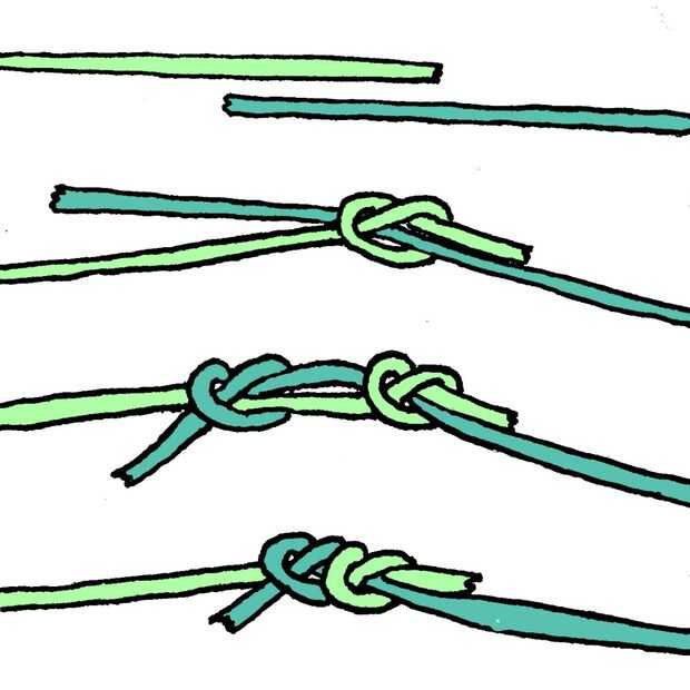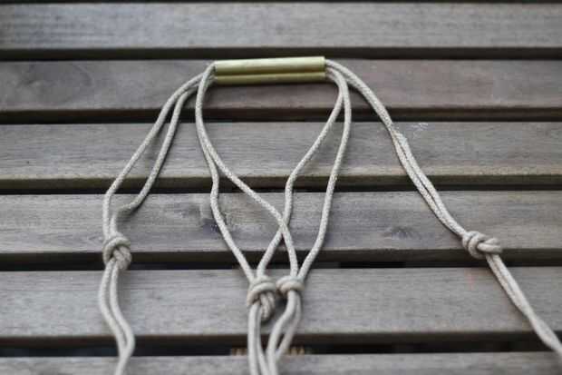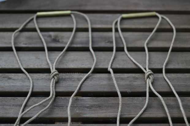 - Una segunda fila de nudos de lazo. Separar los dos filamentos, uno irá hacia la derecha y uno a la izquierda. Y dos hilos se darán cita para la siguiente fila de nudos. Mida 3" hacia abajo desde tus primeros nudos y amarrar su segunda fila de nudos. (La distancia de hilo entre cada conjunto de nudos debe ser 3".)