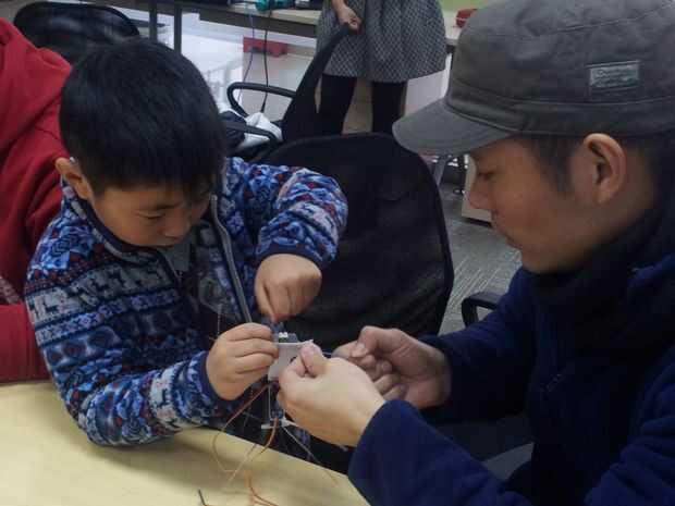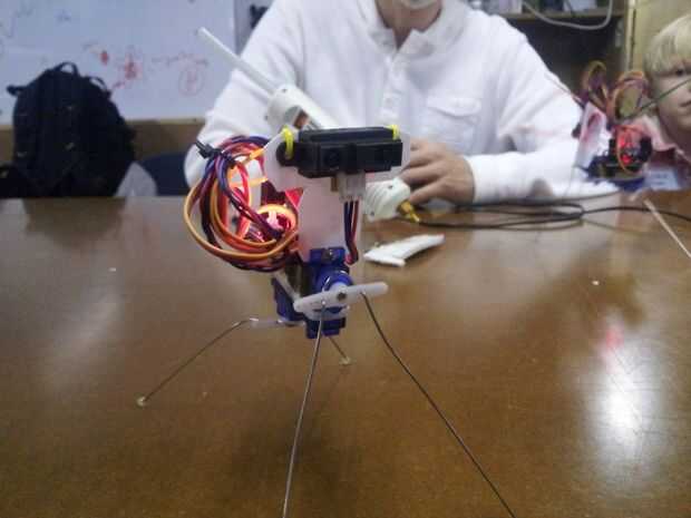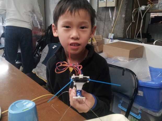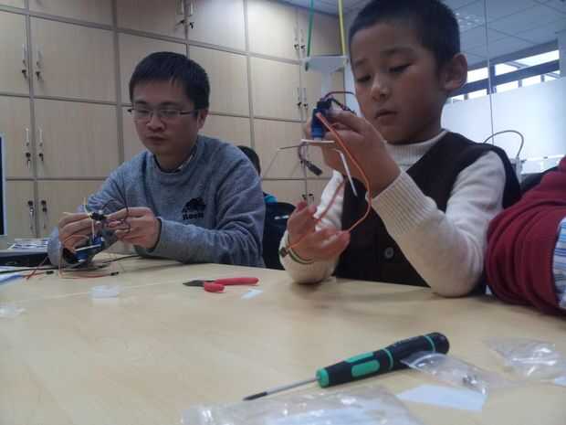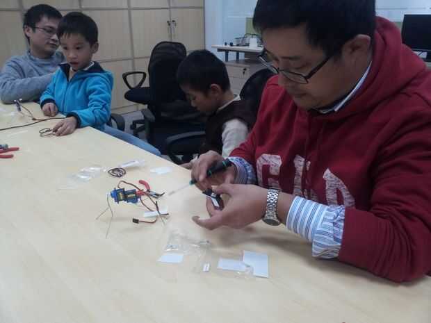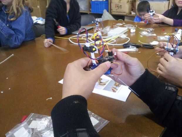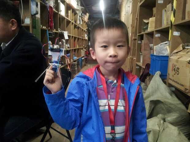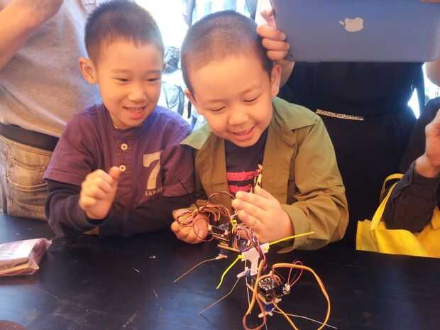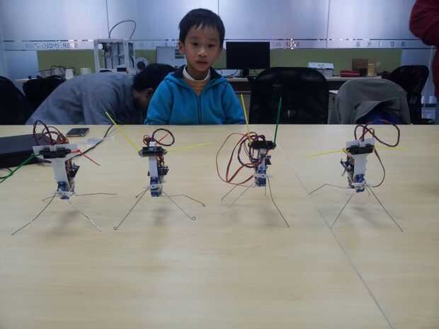 Ese pequeño robot es toda una estrella en nuestro local Shanghai Hackerspace Xinchejian. Hemos hecho muchos talleres para niños construirlos. Estos niños tenían un montón de diversión y cada uno de los robots estaba buscando diferentes después de terminarlo. Los niños utilizan los materiales de la construcción para decorar los pies ellos, pegados en las patas de alambre o cortar el soporte del sensor en diferentes formas.