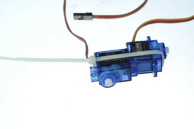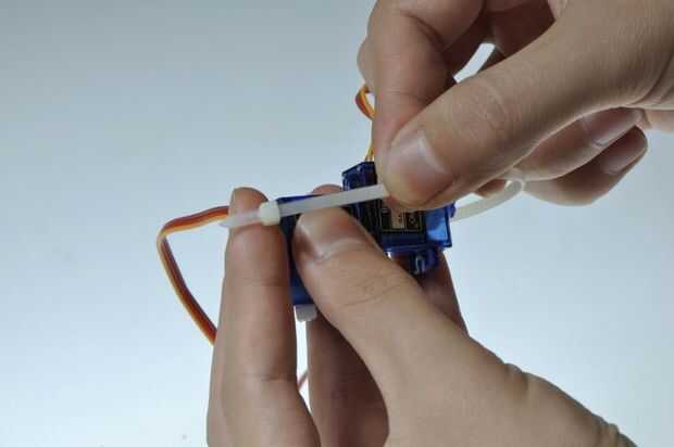 Envolver un atador de cable grande (4x200mm) alrededor de los dos servos para asegurarlos. Tire de la atadura de cables muy apretados para los servos juntos. Puede utilizar pinzas para darle el tirón final.