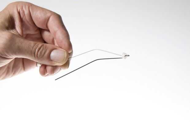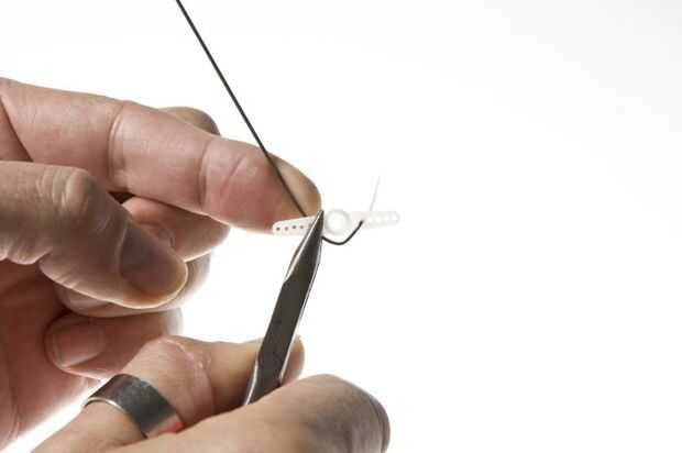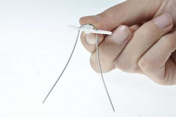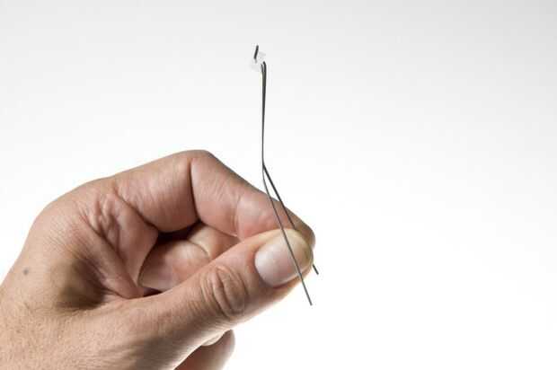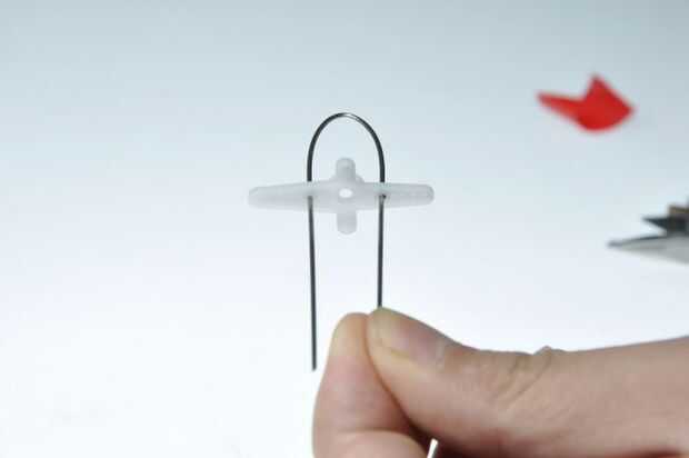 Ponga los dos extremos de la pierna de alambre a través del segundo agujero del centro y luego doblar las dos piernas separadas como se ve en la foto. Sujete las patas de alambre y el cuerno del servo con pinzas y doble el cable cerca del cuerno del servo hacia abajo. Usted puede usar el cuerno del servo que se muestra en la foto o cualquier otro que viene con los micro servos.
