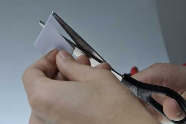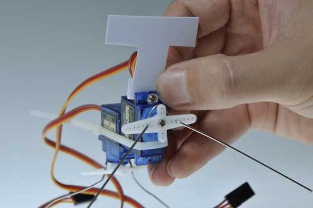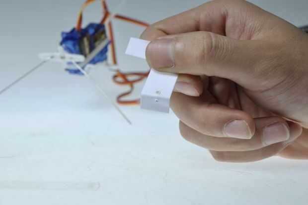 Opcional: Doble el extremo alrededor de 5mm al doble del espesor del material, si usas plástico delgado para tener más agarre para el tornillo. Perforadora/taladro un pequeño agujero en la parte inferior. Estos agujeros no deben ser mayores que el diámetro del tornillo para garantizar que el tornillo está llevando a cabo. Instale el soporte del sensor con un tornillo del accesorio en la parte superior del servo delantero servo.