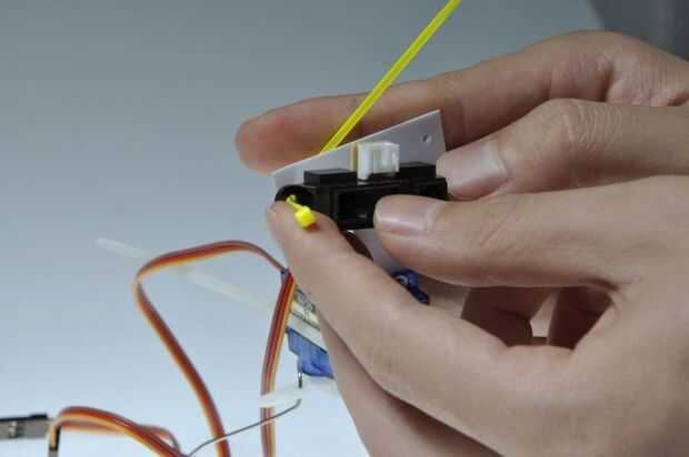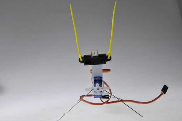 Hacer dos agujeros para el sensor de infrarrojos colocando el sensor en el soporte y marque los orificios. Luego de realizar los agujeros con 2mm de diámetro con tijeras u otra herramienta apropiada. Fijar el sensor con el conector hacia arriba sobre el soporte mediante el uso de dos bridas pequeñas. Usted puede cortar los amarres de cable pero son buenos utilizarlos como antenas o calibradores de espesor según lo visto por los insectos.