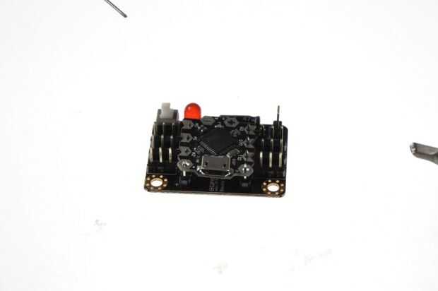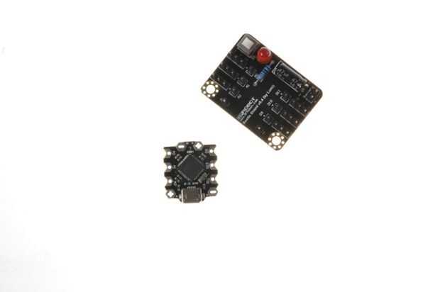 Nota: El tablero Beetle es DFRobots pequeño Arduino compatible MCU con 3 x E/S digital y 3 x E/S analógica así soldar pads para RX/TX y cuatro O de la parte trasera del tablero. El escudo de escarabajo es por ahora sólo está disponible en el kit mini robot insecto