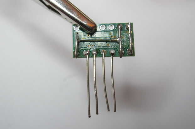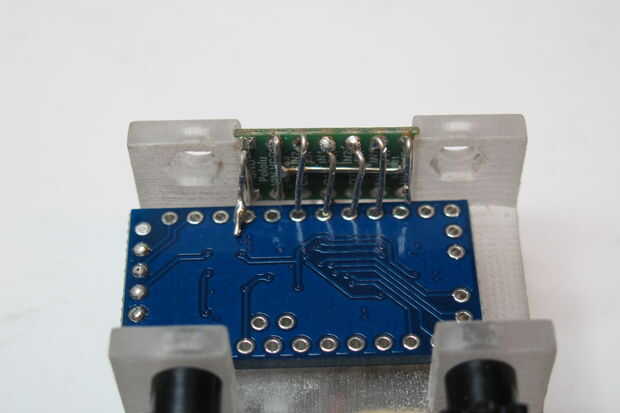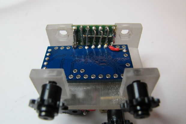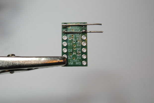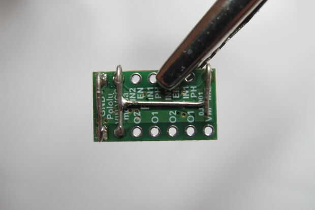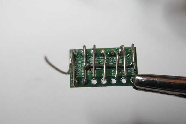 Preparando la tarjeta de conductor es la parte más exigentes. Motivos y VCCs deben ser conectado (pero no uno con el otro) primero y luego pueden soldar cables a los pines de control del motor. Estos pines al Mini de soldadura requiere algo de práctica, pero esto se puede hacer con el alambre flexible en lugar de otro para hacer las cosas (un poco) más fácil.
