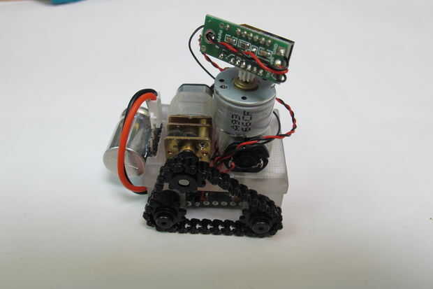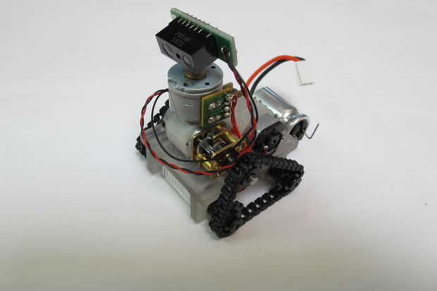 Después de soldar los tres cables para el sensor de infrarrojos me aseguré de dejar suficiente holgura extra en el cable. Usé alambre flexible extra fino porque el motor de pasos es sólo lo suficientemente fuerte para superar una cierta rigidez de alambre.