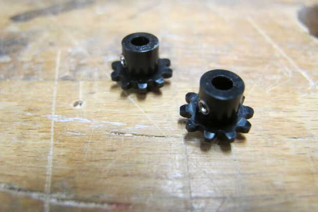 Los piñones de cadena mini de McMaster Carr no vienen con los tornillos: (. Esto hace que un piñón al eje del motor un reto de montaje.