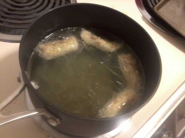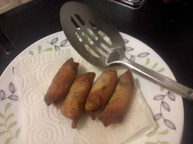Lugar 4-7 de tus rollos de huevo, dependiendo del tamaño, en el aceite. Freír 2-4 minutos o hasta que estén doradas.