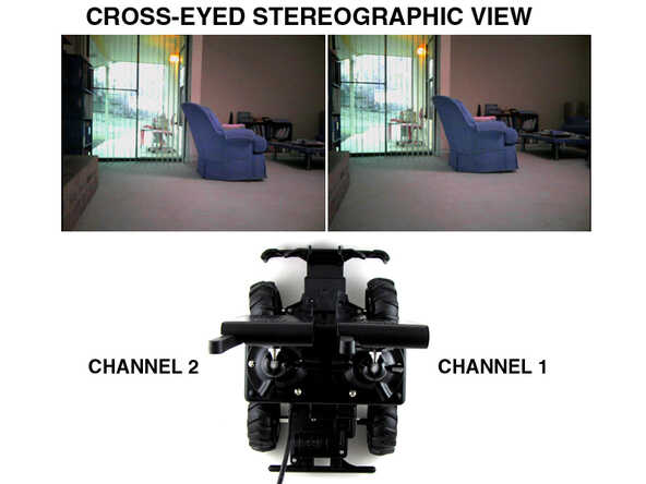 Estereoscópica 3D. Conjunto ambas cámaras hacia adelante en el mismo ángulo y altura. Si sabes cómo ver estereogramas, puede definir el receptor a modo de "Quad" y ver que el video ya sea en paralelo o perezoso estéreo video, alimenta un completo 3D itinerante experiencia.
