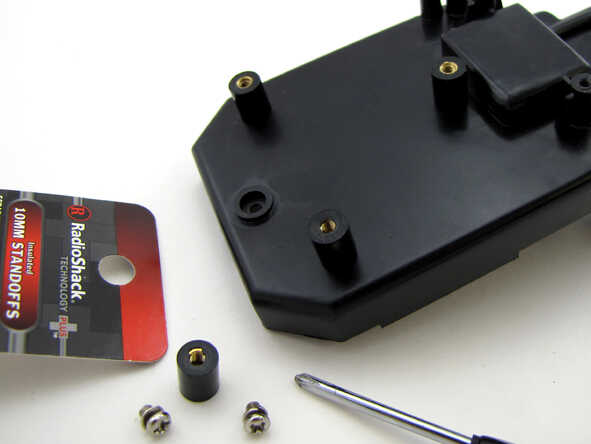 Vuelta el compartimiento de la electrónica cubierta sobre y colocar tres separadores de 10cm en la parte superior de la cubierta del compartimiento con los tornillos que vienen con los separadores.