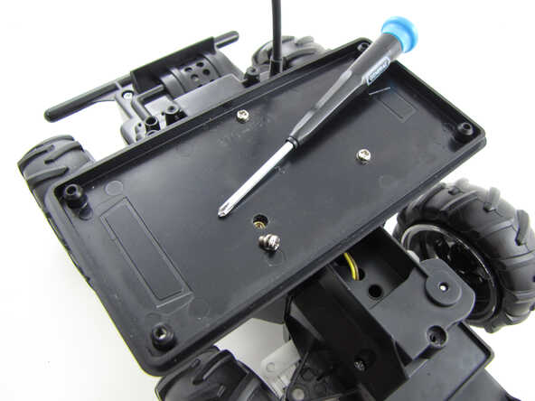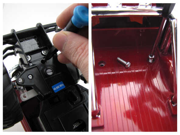 En primer lugar, separar la carrocería del carro del chasis, retirando los 3 tornillos: 2 en la parte superior, en la cama del camión y 1 de abajo, entre las ruedas delanteras.
