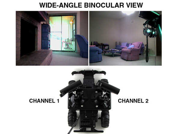Visión binocular gran angular. Ángulo derecha e izquierdas las cámaras hacia fuera a cada lado por unos 30°. La cámara izquierda debe asignarse canal 1 y la cámara derecha canal 2. Ver lado a lado ajustando el receptor al modo de "Quad". En conjunto, las 2 cámaras proporcionan un 120° campo de visión mucho más natural.