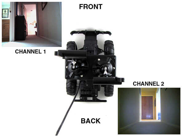 Cámara de marcha atrás. Punto de la cámara izquierda adelante y la cámara de derecha a la parte posterior. Alternar entre ellos, según sea necesario (por ejemplo, al dar marcha atrás el coche), por ciclo entre los 2 canales en el receptor. No importa que cámara va en que canal en este modo.