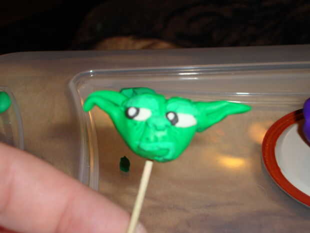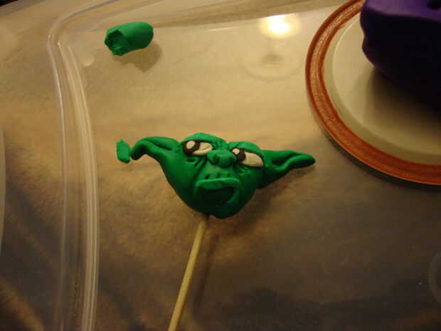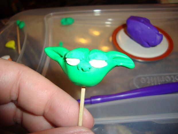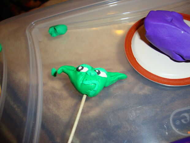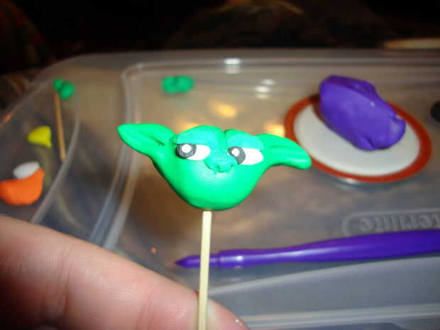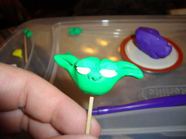 Rollo de una bobina pequeña de arcilla blanca, cortado a la medida. Coloque la bobina en el párpado y aplanar hacia fuera usando una selección de diente. Rodar una pequeña bola de arcilla verde y pone entre los ojos y uso selección de un diente para dar los detalles de la nariz. Estirar dos bolas pequeñas de barro negro ponga cada bola en el lado del ojo y rodillo hacia fuera plana en la parte blanca del ojo utilizando un palillo de dientes. Desplegar una pequeña bobina fina y colocar en la forma de un 7 en la cara, esto le dará a su boca. Por último, utilice el palillo de dientes para agregar más detalles a la cara añadiendo las grietas.