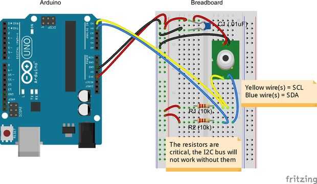 Nota: las resistencias se utilizan para mantener las líneas SCL y SDA alta hasta que se tiraron bajo el sensor.
