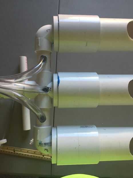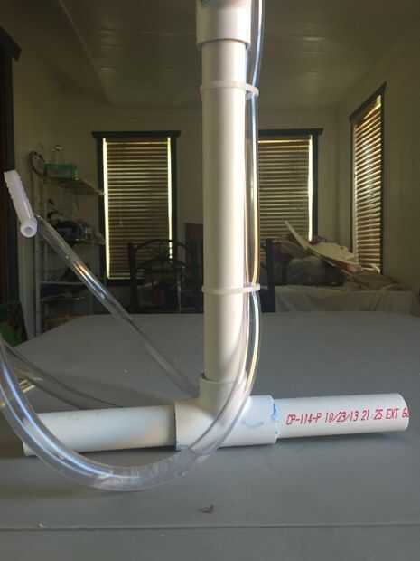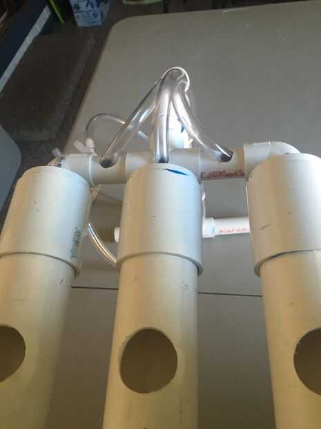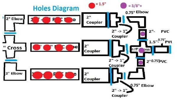 Nota acerca de los agujeros: los agujeros de 1.5" son donde serían las macetas y las plantas. Deben ser espaciados uniformemente en la tubería de 2". Los orificios de 3/8 son para el tubo de vinilo. Que tenga que raspar los bordes de los agujeros para hacer un ajuste apretado con los tubos. Te recomiendo = d lijado hacia abajo de los agujeros de 1.5".
