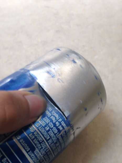 Hacer un corte con la sierra en la línea que anotó en el poder. Después de este sólo tiene que pulsar alrededor de la lata en la parte superior. No PRES en la parte inferior o se mella el Can. Debe tener una 2 piezas de fondo bastante limpiamente cortado por el final de esta. Los bordes serán afilados así que tenga cuidado de no cortarse.