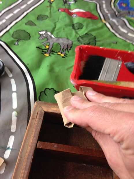 - Lije la madera ligeramente. Esto se puede hacer mejor con una lija no muy gruesa. He utilizado un bloque de lijado hecho en casa (un pedazo de madera de 3,5 x 5 cm para envolver el papel de lija alrededor) arena más rápido y mejor; de esta forma que se puede lijar bien en todos los rincones. Asegúrese de suavizar la madera y por favor no lijar demasiado.