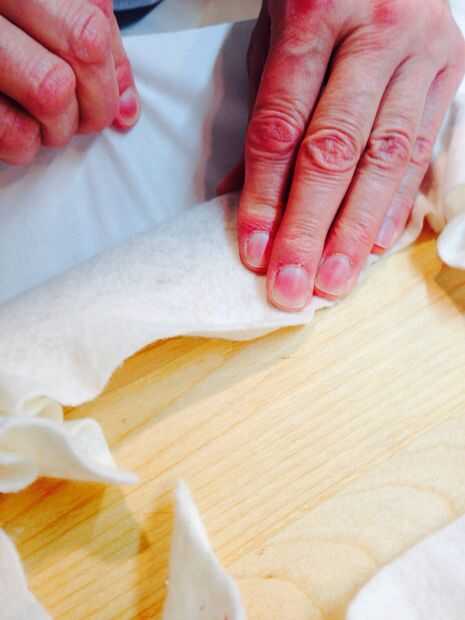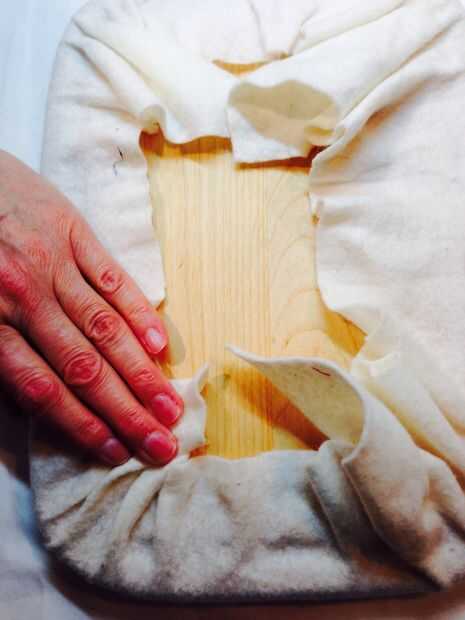 5. repetir en el centro de una de las esquinas, facilidad en la plenitud de la guata y la tela y cuidadosamente de la grapa en el lugar.