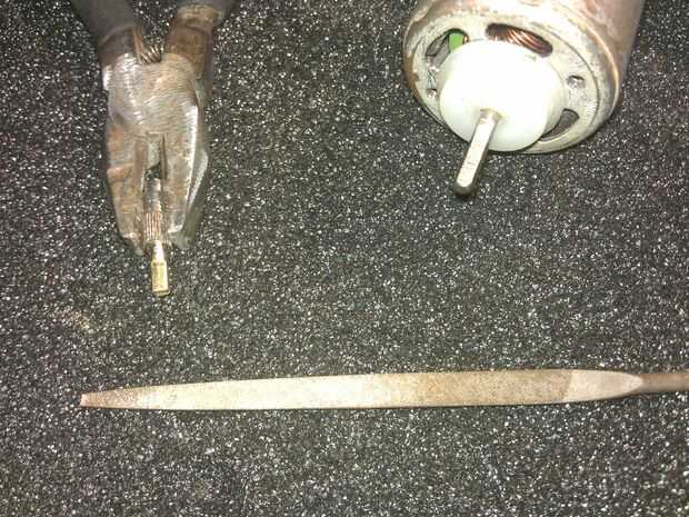 No es necesario, pero debe hacerlo. Tomar su mini chuck (pierna de los compases) y coloque en un tornillo o sujetar con una pinza. Entonces necesitamos un archivo de diamante o de metal pequeño, y tienes que hacer una pequeña área plana en el eje de tiradas. (La razón de por qué hice esto - los tornillos de la terminal proporcionará un mejor agarre en un área plana que en un eje circular)