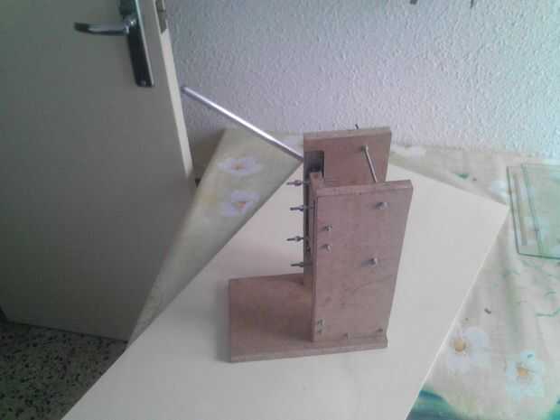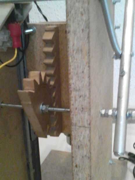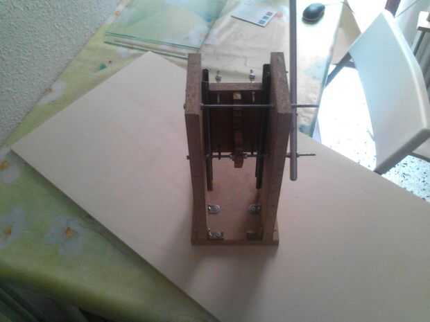 El movimiento de estas guías se consigue utilizando una palanca, retenida por un resorte. El movimiento de esta palanca gira un engranaje (hecho por mí, madera), que mallas con una parrilla en el soporte de taladro.