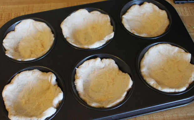 Estiramiento (o rollo) el pastel hasta su lo suficientemente grande como para llenar un molde de muffin.  Recomiendo no engrasar la sartén.  Hace una PITA real porque la masa no permanece arriba y mantiene contracción detrás.  Sólo tiene que pulsar la masa en cada bolsillo y mantenga los dedos cruzado el puesto de estancias.