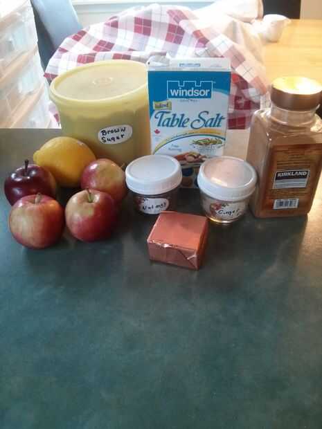 Corto a 3 manzanas de Macintosh (use su favorita) aproximadamente y colocar en una olla con el zumo y la ralladura de medio limón, 2 1/2 cucharadas de azúcar moreno, 1 cucharada de margarina, 1 cucharadita de canela y 1/4 de cucharadita de jengibre y nuez moscada.
