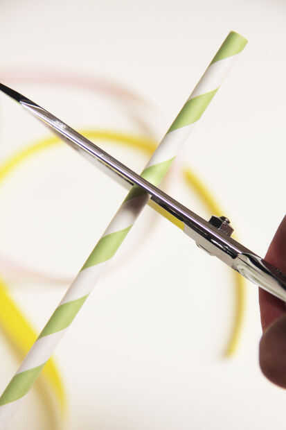 Con el tamaño de tus mini pastelitos como guía, corte la paja a la altura deseada. Cortan tres longitudes de la cinta a la longitud deseada. Quería que cada filamento acabado para colgar 10" de largo así que los tres longitudes de corte en 20" cada.