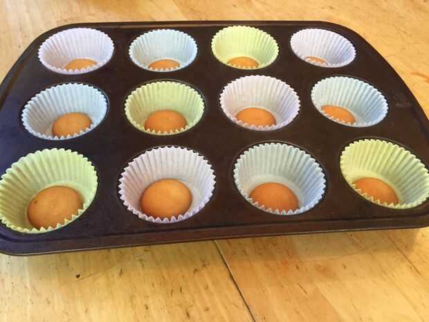 Línea una lata del mollete con los trazadores de líneas de la Magdalena y luego pop una oblea de vainilla en el fondo de cada línea.