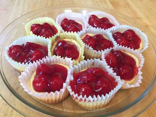 Deje que el pastel se enfríe y luego desmoldarlos muffins. Cubra cada uno con una cucharada del relleno de pastel de cereza.