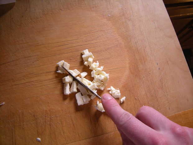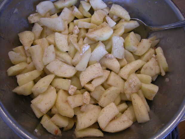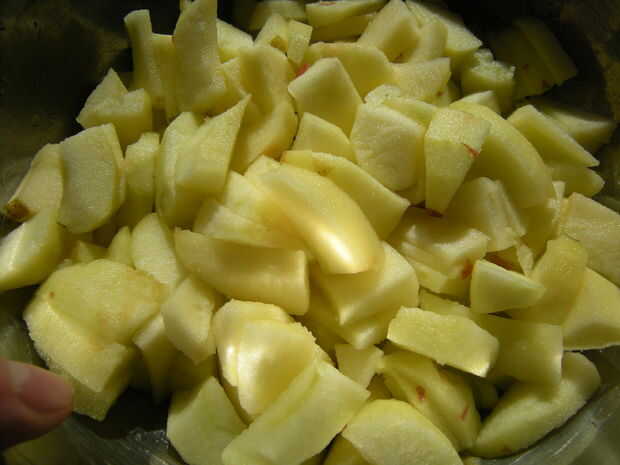Lavar, núcleo y pelar las manzanas. Corte en rodajas finas (como para un pie normal), luego cortar estas rodajas en medio. Ninguna pieza debe ser más grande en tamaño de un cuarto.