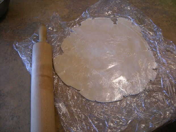 Tomar la corteza de la nevera y colocar entre dos hojas de envoltura de plástico. Haciendo esto en vez de flouring tu superficie de trabajo, no añadir más harina a la corteza, evitando que se seque. Extienda la corteza hasta que quede aproximadamente 1/8" de espesor.
