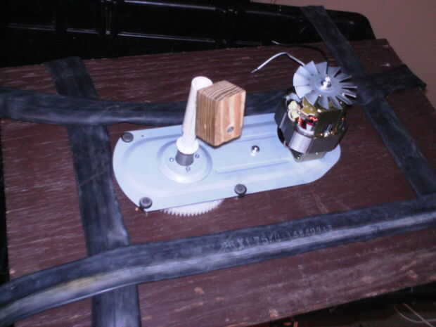 Después de colocar el motor en el lugar correcto, presione hacia abajo en él. Luego recogerlo. Encontrar las huellas de los pernos para los engranajes en la madera y utilice una broca grande para ahuecar hacia fuera. Especialmente tuve que hacerlo porque los tornillos estaban apenas tiempo suficiente para llegar al tablero superior después que taladrar los agujeros. Luego, reemplace el montaje, colocar los tornillos en los orificios recién perforados. Pero no perfore a través de todo el camino! Limpiar la parte superior! También tenga cuidado con los engranajes en la Junta.