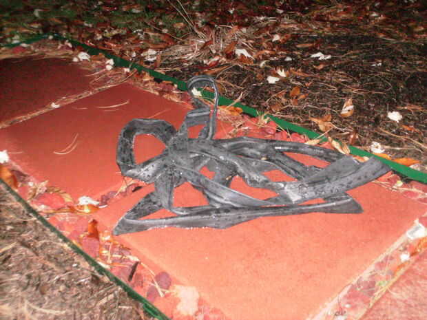 Para colgar la plataforma de los lados del recipiente, encargué primero el tubo de la bicicleta las tiras para que sean paralelas y cruzadas en cuatro puntos (ver fotos). En cada intersección, asomó un agujero con las tijeras y luego roscados tornillos pequeños para madera, con una arandela.