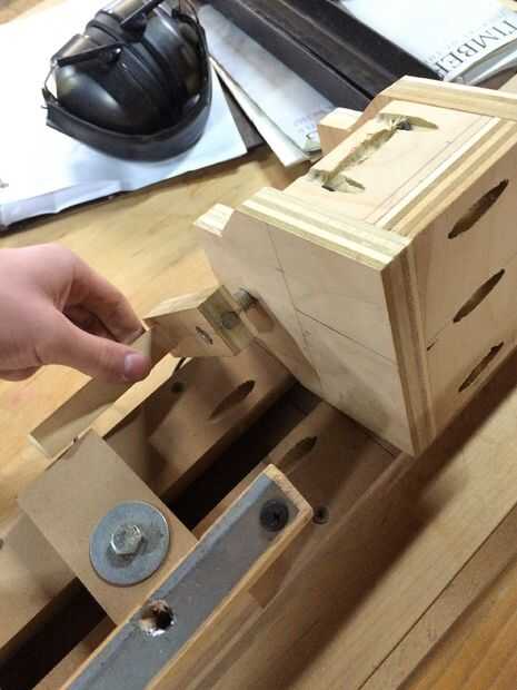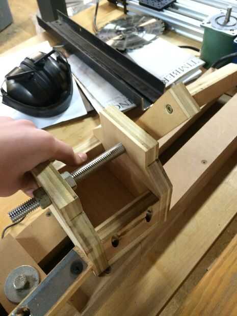 5) la última cosa a hacer es cortar un trozo de madera contrachapada de 3 1/2" por 2" y perfore un orificio de 3/8" en el centro. Esto se convertirá en la tuerca para un perno que bajará a través del agujero la parte inferior del cabezal móvil que puede ajustarse para mantener los residuos en su lugar.