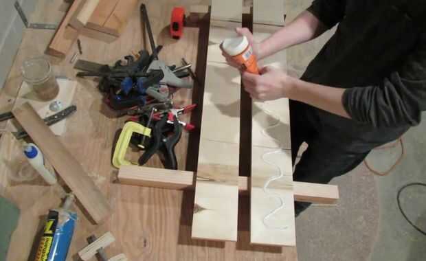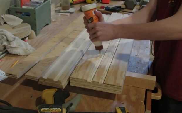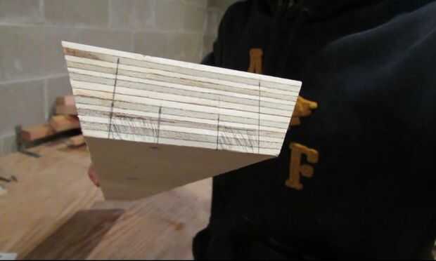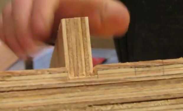 El riel superior se forma una larga cola de pato, con los lados en ángulo de 20°. Otra vez tuve que pegar dos pieza de madera contrachapada para obtener el espesor adecuado. Después se cortaron todas las piezas, pegué todos juntos, esta vez con pegamento de madera.
