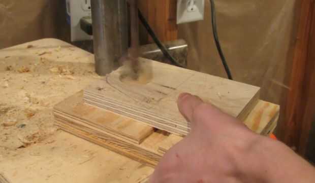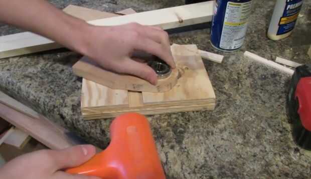 La primera parte en la construcción de la contrapunta (lo que impulsa a la madera), fue hacer los montajes de rodamientos. Si usted sigue las especificaciones de los planes, irá sin problemas. Los planes llaman para dos capas de madera contrachapada en cualquier lado, pero el tornillo que tenía no era lo suficientemente larga para manejar, así que tuve que usar una pieza de roble en su lugar. Encontré una vieja broca ligeramente sobredimensionado para el cojinete, y tierra ligeramente por lo que tendría un ajuste apretado en la madera.
